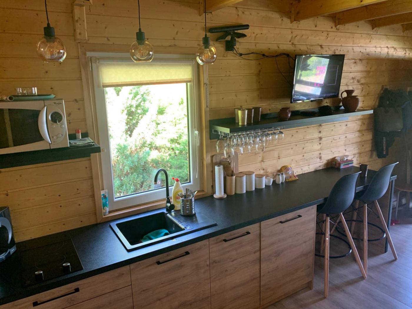 W domku letniskowym do dyspozycji gości przygotowano część wypoczynkową oraz kuchnię z lodówką. Wyposażenie obejmuje też telewizor z płaskim ekranem z dostępem do kanałów kablowych.